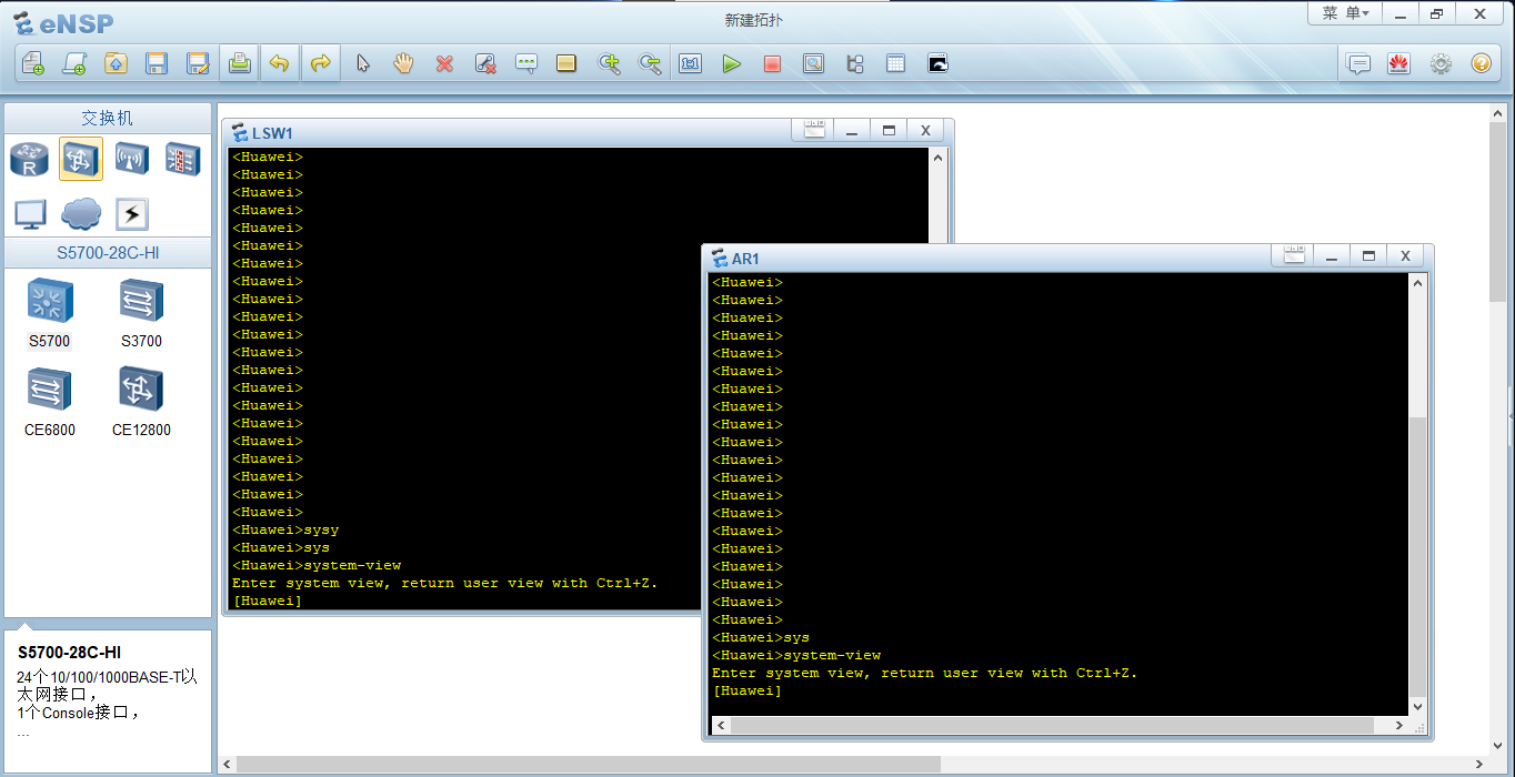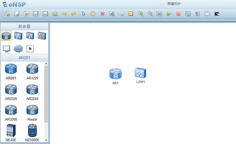 2)在打开的拓扑图中拖入以下虚拟设备。(分别是路由器分类中的AR201与交换机页面中的S5700)