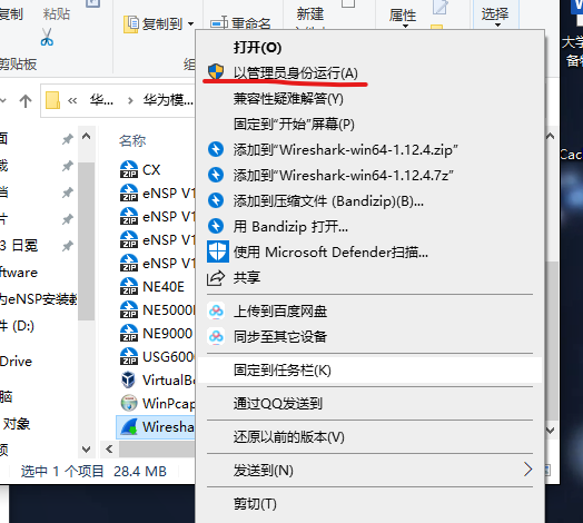 在解压出来的文件夹内找到WS的安装包,同样右击使用管理员身份运行,并更具步骤完成安装。(注意:在安装Wireshark的同时将会安装WinPcap,如果没有自动安装可以在解压出来的文件夹内找到WinPcap的安装包,使用管理员身份进行安装即可,本文不在赘述)