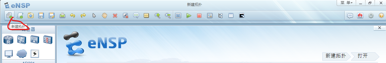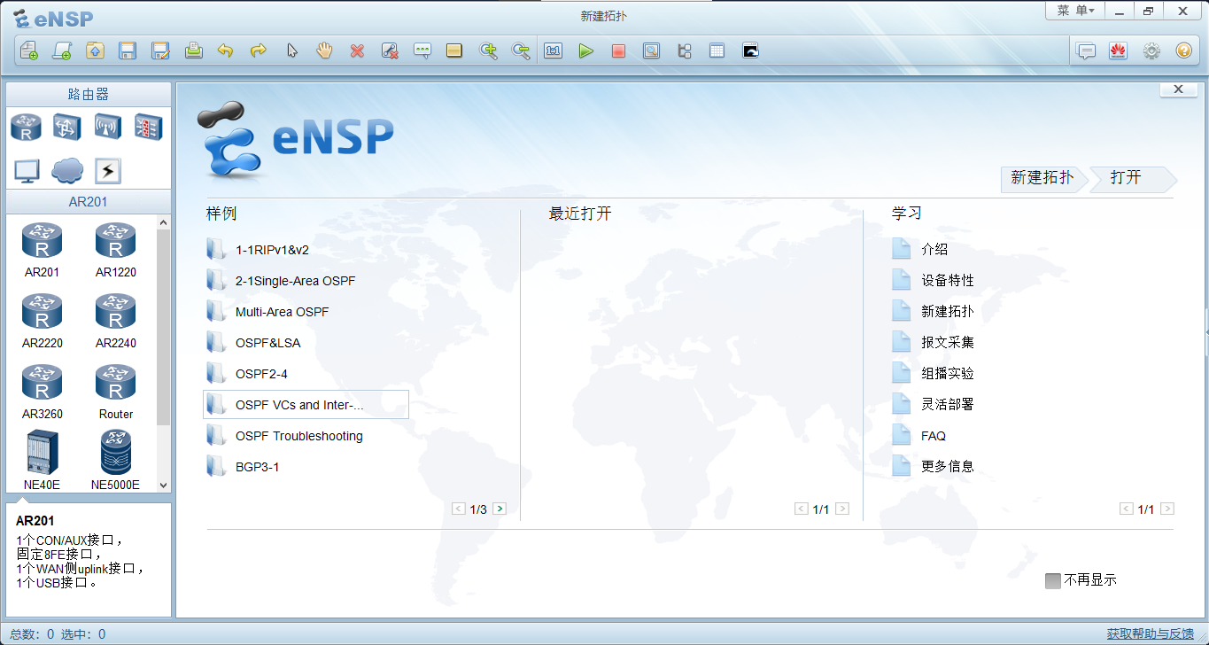 3)完成安装后将弹出eNSP的主界面。如果显示以下界面即为安装成功。
